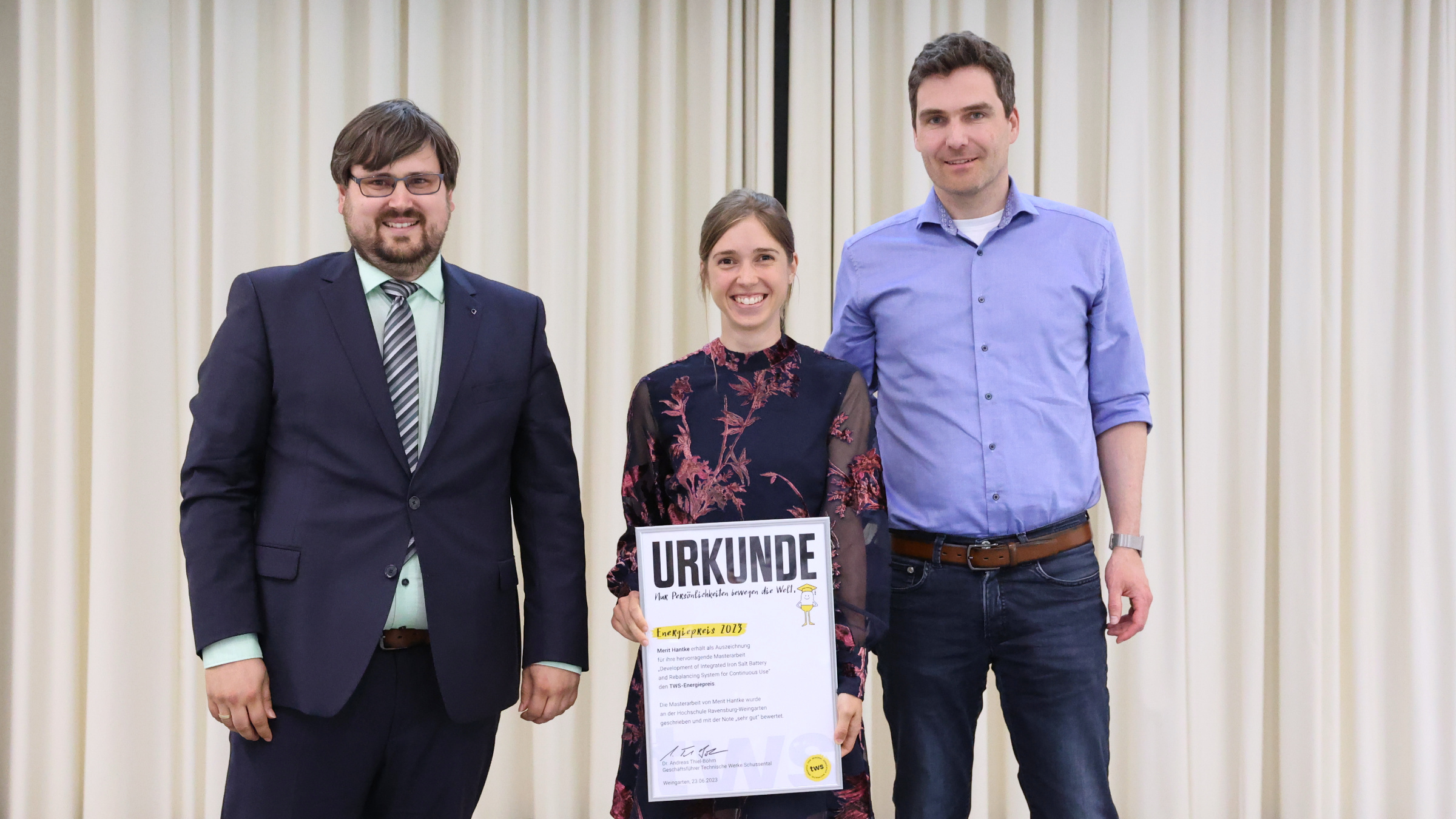 Merit Hantke, also a graduate of the Product Development in Mechanical Engineering programme, received the tws Energy Award. She dealt with the iron-salt battery in her master's thesis and "makes an important contribution to sustainable energy", said Simon Scholz, department head of the TWS networks, who was allowed to present the prize.
