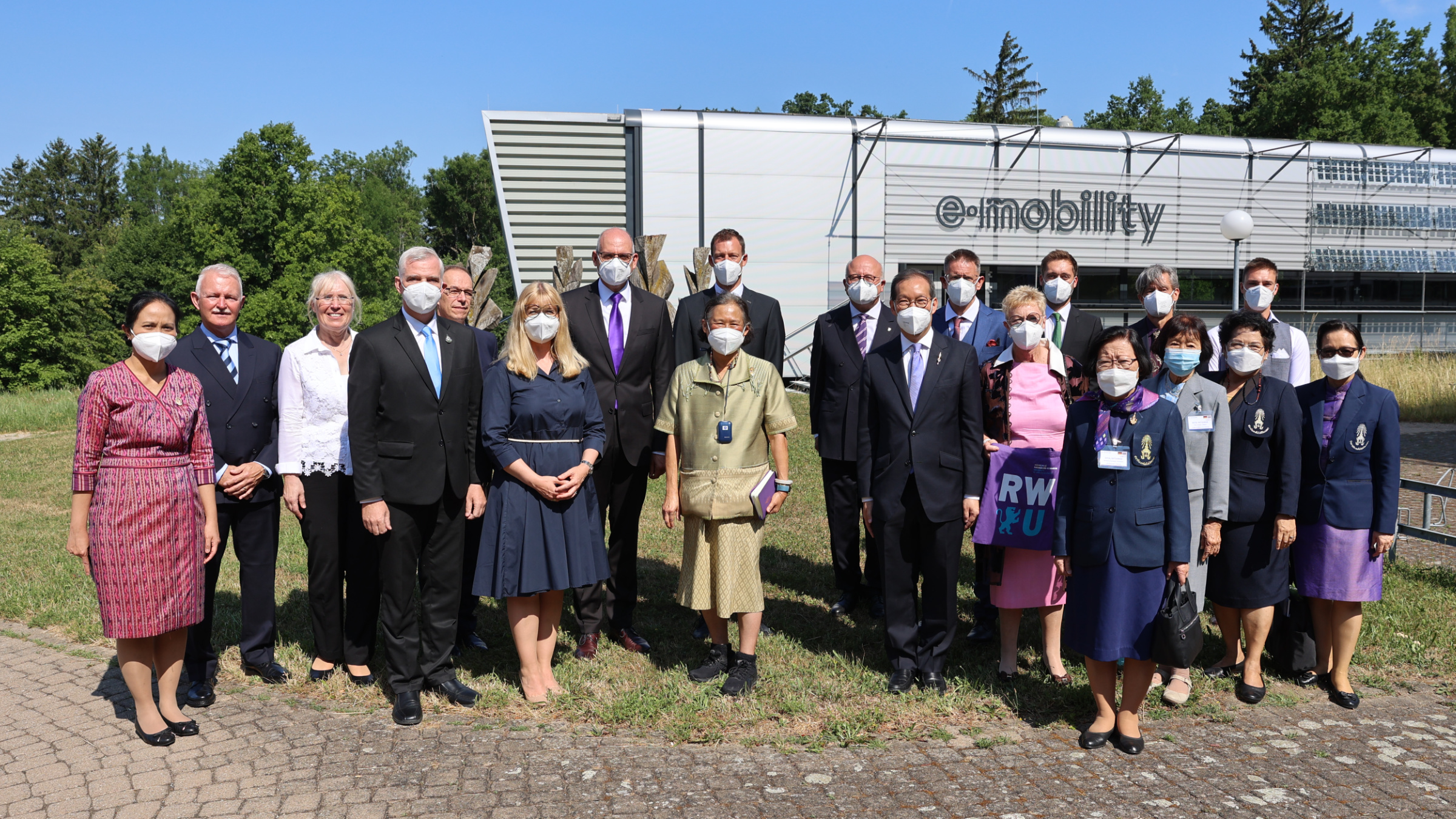 After signing the Golden Book of the City of Weingarten, Maha Chakri Sirindhorn and the Thai delegation visited the E-Mobility Laboratory. Professor Dr Benedikt Reick gave a tour of the new premises and demonstrated current work such as an autonomous bicycle load trailer or a research project to optimise the cooling of e-motors.