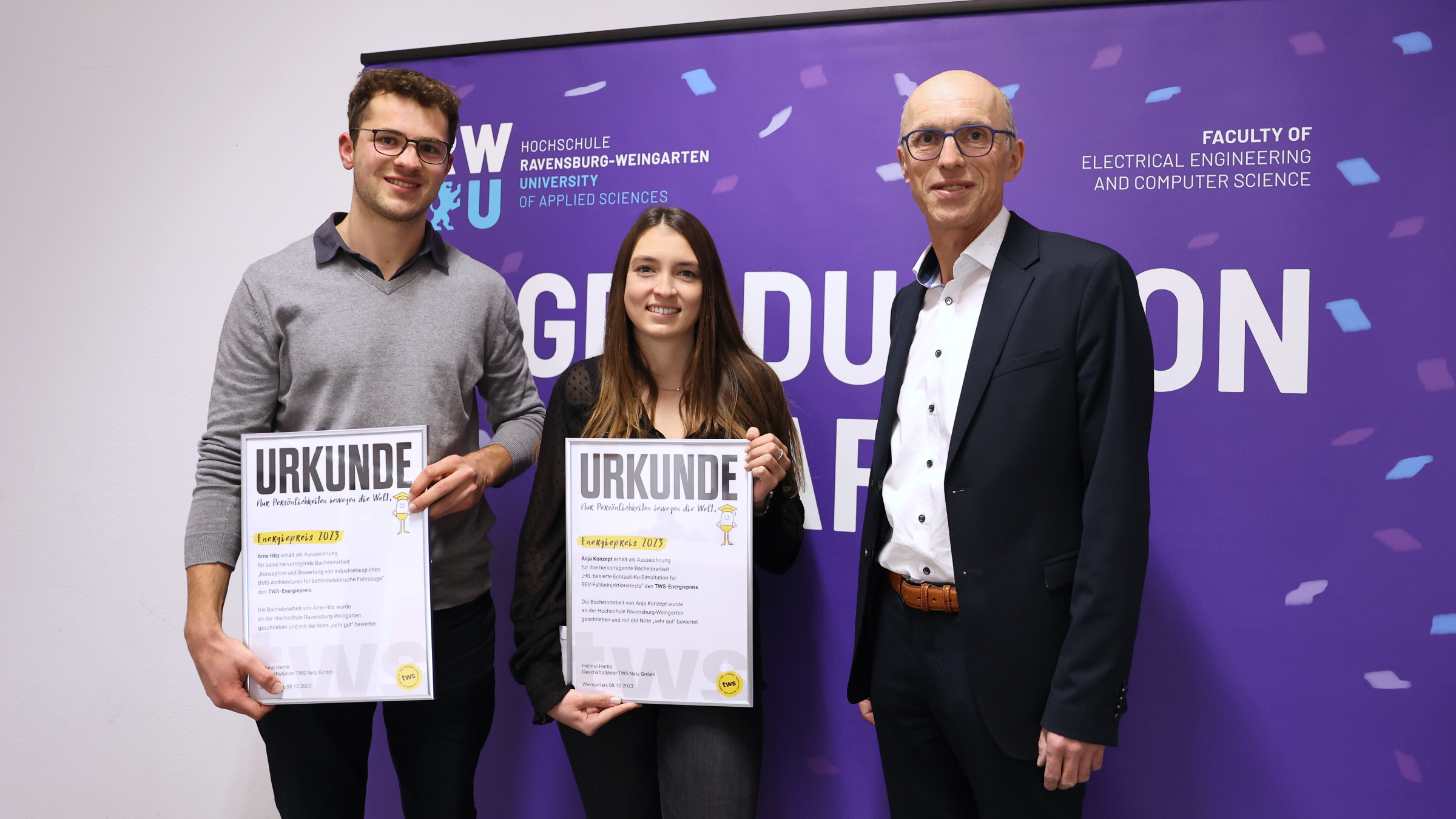 The prize from Technische Werke Schussental was awarded twice that evening: to Anja Konzept and Arne Hitz, both graduates of the bachelor's degree program in E-Mobility and Green Energy. The Students' Union Award went to Anton Gres for his above-average engagement.