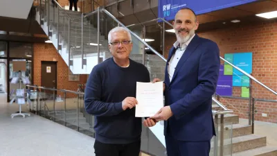 Zu seinem 25-jährigen Jubiläum im öffentlichen Dienst bekam Professor Dr. Markus Rager von Kanzler Henning Rudewig die Dankesurkunde des Landes Baden-Württemberg überreicht.