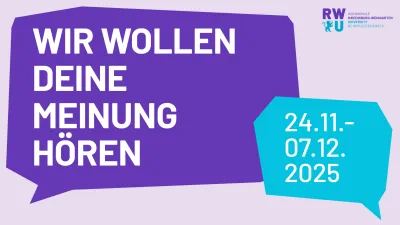 Teilnehmen und mitgestalten: Von 24. November bis 7. Dezember 2025 können Studierende, Lehrende und Mitarbeitende die Studien- und Arbeitsbedingungen an der RWU bewerten und Verbesserungen vorschlagen.