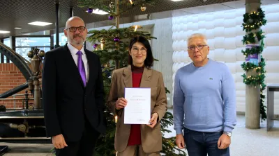 Anlässlich ihres 25-jährigen Dienstjubiläums wurde Lucia Mengis für ihre Mitarbeit an der RWU geehrt. Rektor Professor Dr. Thomas Spägele und Kanzler Henning Rudewig überreichten die Dankesurkunde des Landes Baden-Württemberg.
