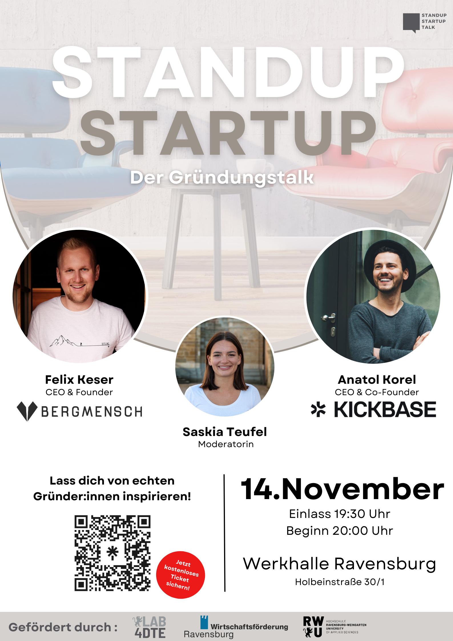 Weingarten – Am 14. November ist das Startup-Zentrum der RWU in der Werkhalle Ravensburg zu Gast: Beim „Standup Startup Talk“ erzählen Anatol Korel, Geschäftsführer und Mitgründer von „Kickbase“, sowie Felix Keser, Geschäftsführer und Gründer des Outdoor-Ausstatters „Bergmensch“, ihre Geschichten von der Geschäftsidee über die Gründung bis zum erfolgreichen Unternehmen.