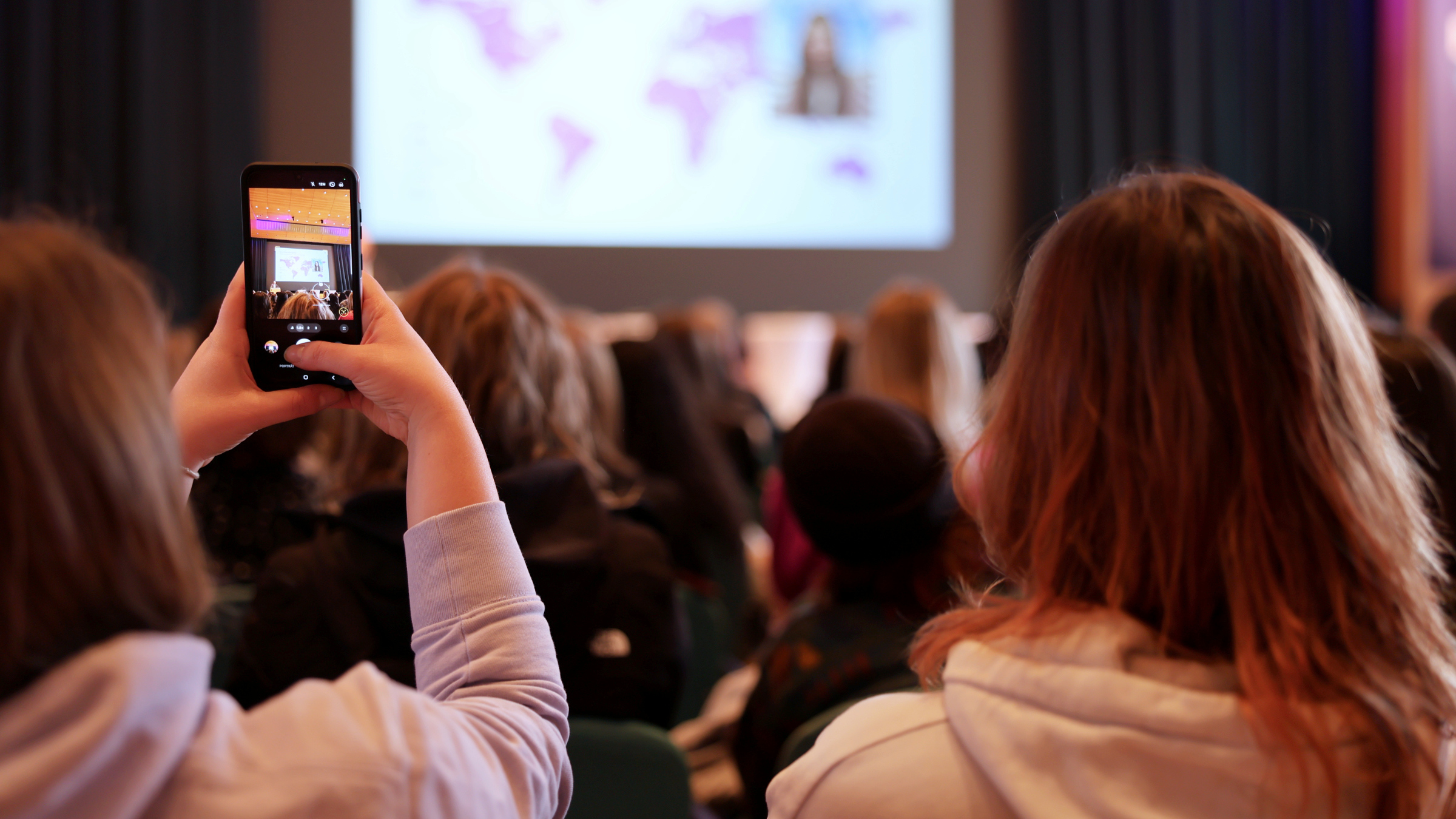 - Eine Studierende macht ein Foto der Präsentation bei der Erstsemesterbegrüßung im Kultur- und Kongresszentrum Weingarten.