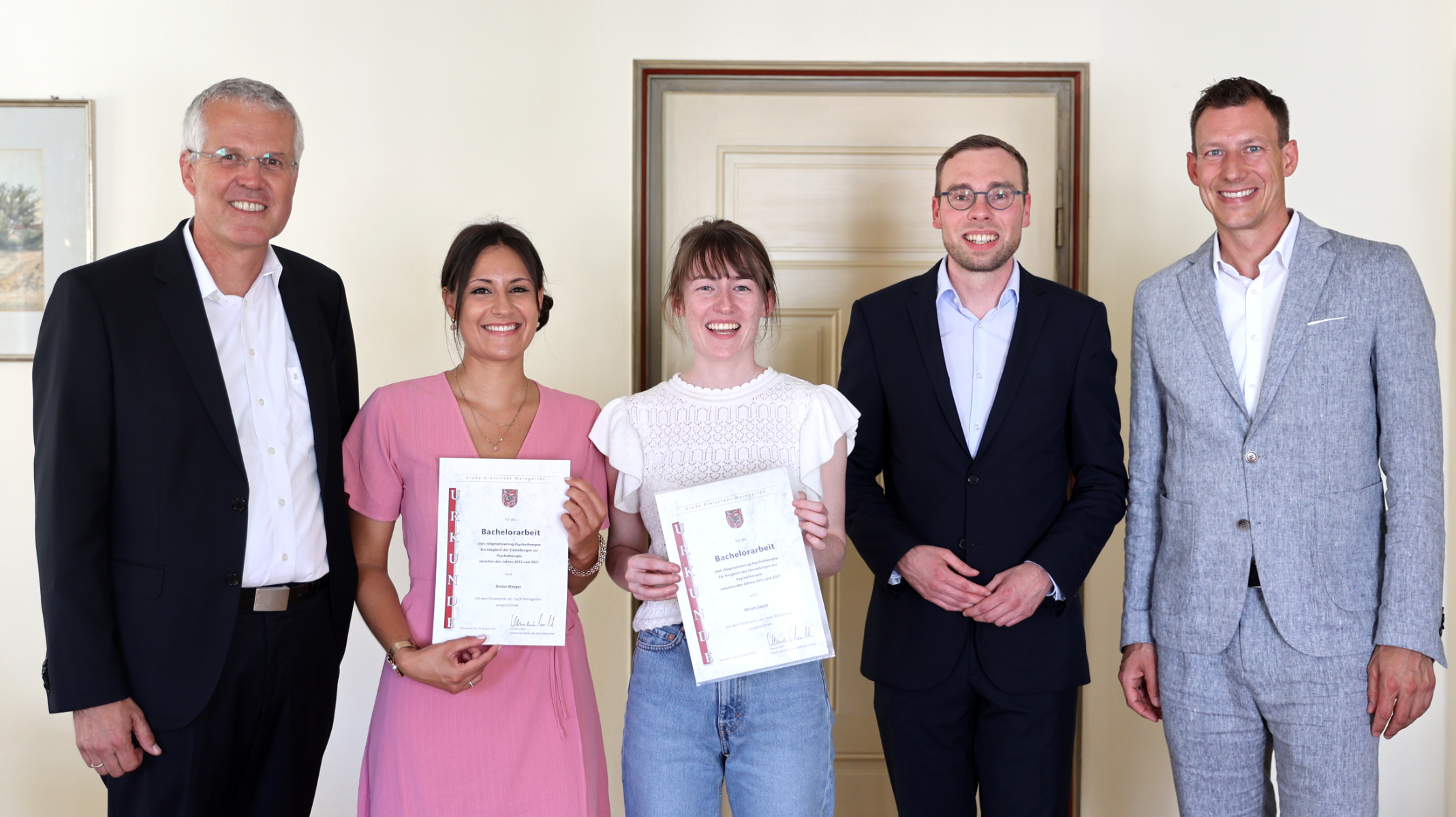 „Das ist ein positives Zeichen für unsere Gesellschaft“, sagte der Weingartner Oberbürgermeister Clemens Moll, der im Namen der Stadt Weingarten den Preisträgerinnen ihre Urkunden überreichte. „Nicht zuletzt durch den deutlichen Anstieg psychischer Erkrankungen während der Pandemie wurde deutlich, wie zentral, wie nah uns dieses Thema ist.“ Darum sei es umso wichtiger, Therapiemöglichkeiten wie die Psychotherapie zu entstigmatisieren, sagte der Oberbürgermeister.
