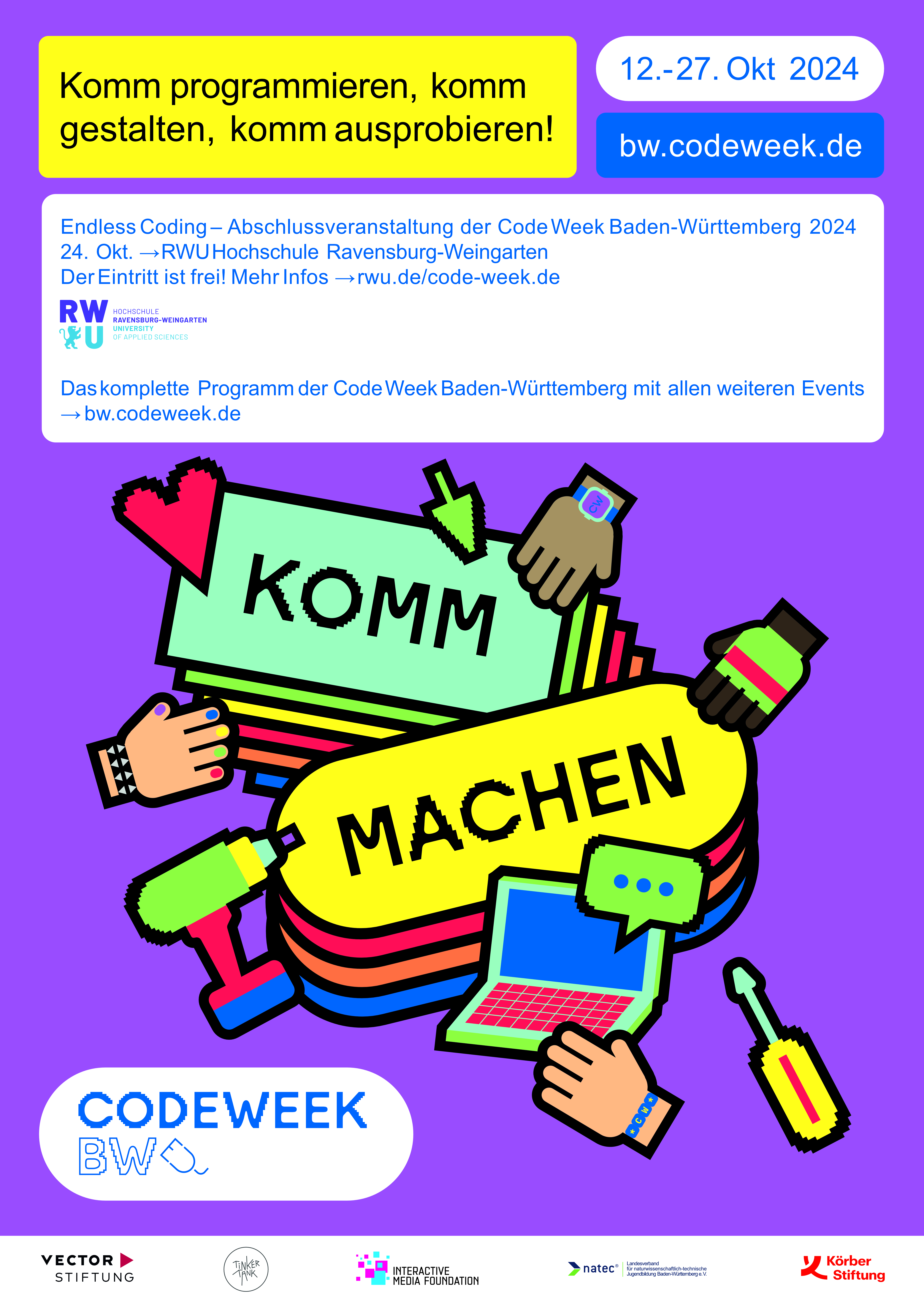 Weingarten – Die Hochschule Ravensburg-Weingarten ist am 24. Oktober offizieller Veranstaltungsort der Code Week Baden-Württemberg. Die Veranstaltung ist eine europaweite Initiative, die der Bevölkerung digitale Kompetenzen spielerisch näherbringen soll. Insbesondere Kinder und Jugendliche sollen durch das Tüfteln, Hacken und Programmieren für die digitale Welt begeistert werden. Aber auch Erwachsene sind herzlich eingeladen. In Baden-Württemberg wird die Initiative von der Vector Stiftung gefördert und von der Kreativwerkstatt TinkerTank koordiniert.