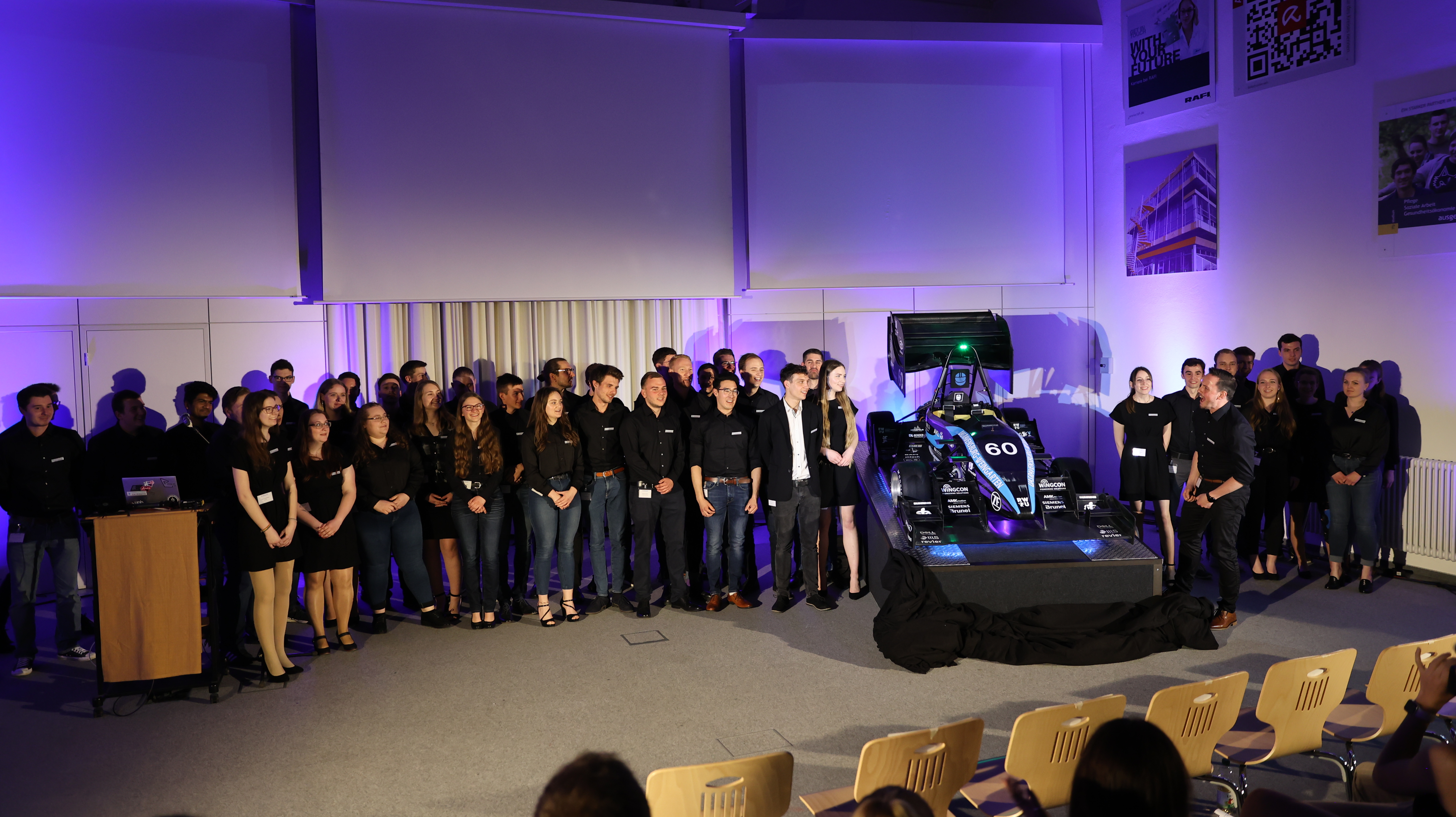 Nach dem Rückblick näherte sich der Abend der Enthüllung des neuen Stinger. Formula Student bedankte sich bei allen Beteiligten für ihre Unterstützung. Ein großer Dank ging auch an Professor Dr. Thomas Spägele, Rektor der RWU. Dieser beglückwünschte das Team für ihr Engagement und ihren Ehrgeiz. „Es ist nicht selbstverständlich, dass wir heute hier sitzen dürfen“, sagt der Rektor. Nicht an jeder Hochschule habe Formula Student die letzten Jahre überdauert. Umso mehr erfülle es ihn mit Stolz, dass Formula Student heute den zweiten elektrischen Rennwagen in Folge präsentiere.