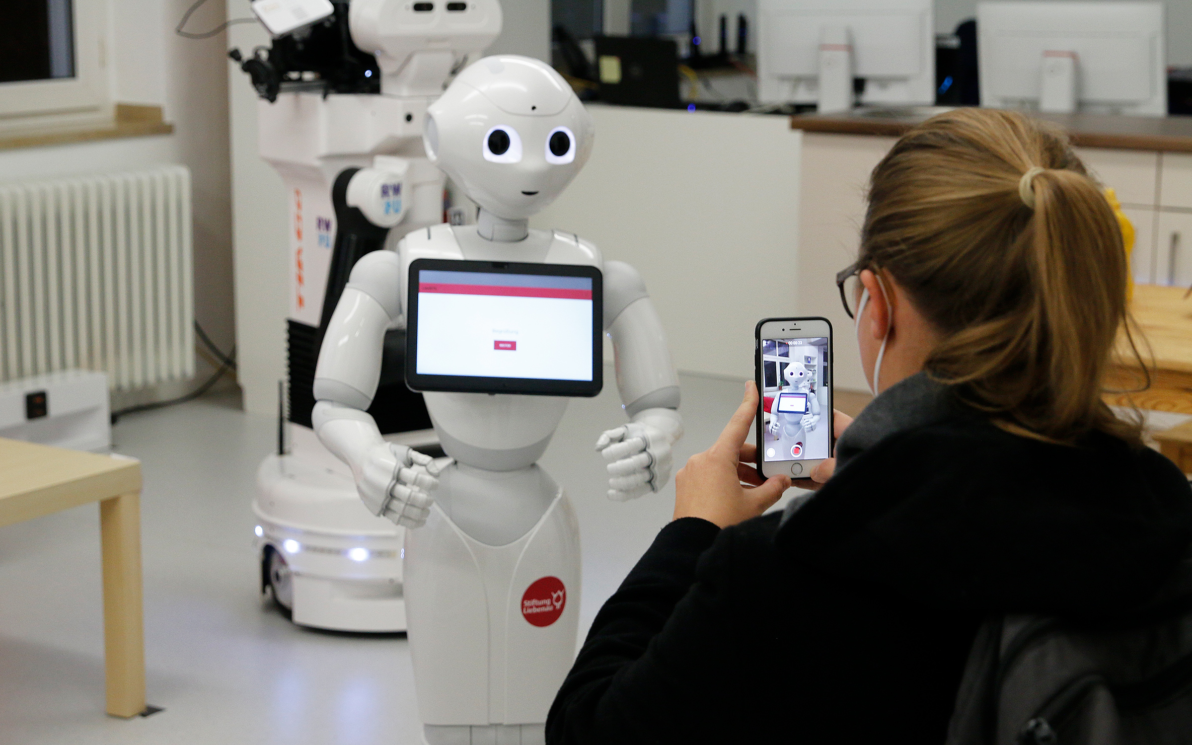 Die Begrüßung im neuen Labor für digitale Transformation und Entrepreneurship (LAB4DTE) übernimmt ein Roboter: „Ich freue mich außerordentlich, Sie im Innovationslabor willkommen zu heißen“, sagt Pepper mit blechener Stimme. „Hier erforsche ich mit meinen menschlichen Kolleginnen und Kollegen intelligente Systeme der Zukunft. Für das weitere Programm übergebe ich an einen Vertreter Ihrer Spezies.“ Sogleich ist bei der Eröffnung des neuen Labors an der Hochschule Ravensburg-Weingarten (RWU) also klar: Hier geht es um die Entwicklung zukünftiger Technologien. Aber dazu braucht es Menschen, ihren Forschergeist, ihre Kreativität und die soziale Kompetenz zur Arbeit in interdisziplinären Teams.