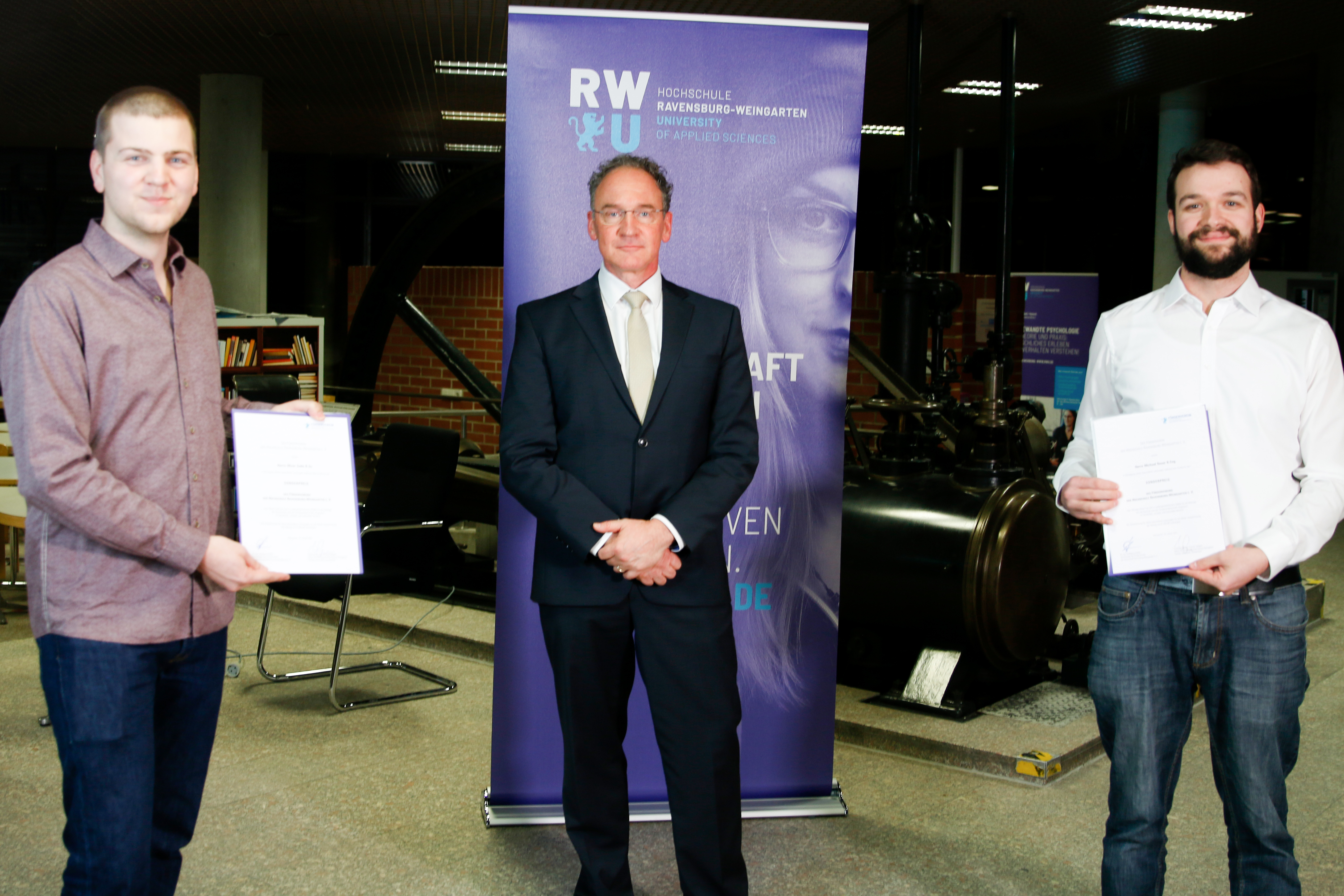 Weingarten - Ein erfolgreiches Studium zeichnet sich durch mehr als gute Noten aus. Daran erinnert regelmäßig die Vergabe des Preises des Fördervereins der Hochschule Ravensburg-Weingarten (RWU). Mit ihm werden Studierende der RWU geehrt, die sich über ihre fachlichen Leistungen hinaus in die Hochschule und die Gesellschaft einbringen. Die beiden Preise für das vergangene Jahr wurden jetzt von Dr. Wolfgang Pfeiffer, dem Vorsitzenden des Fördervereins und Geschäftsführer von TOX Pressotechnik überreicht.