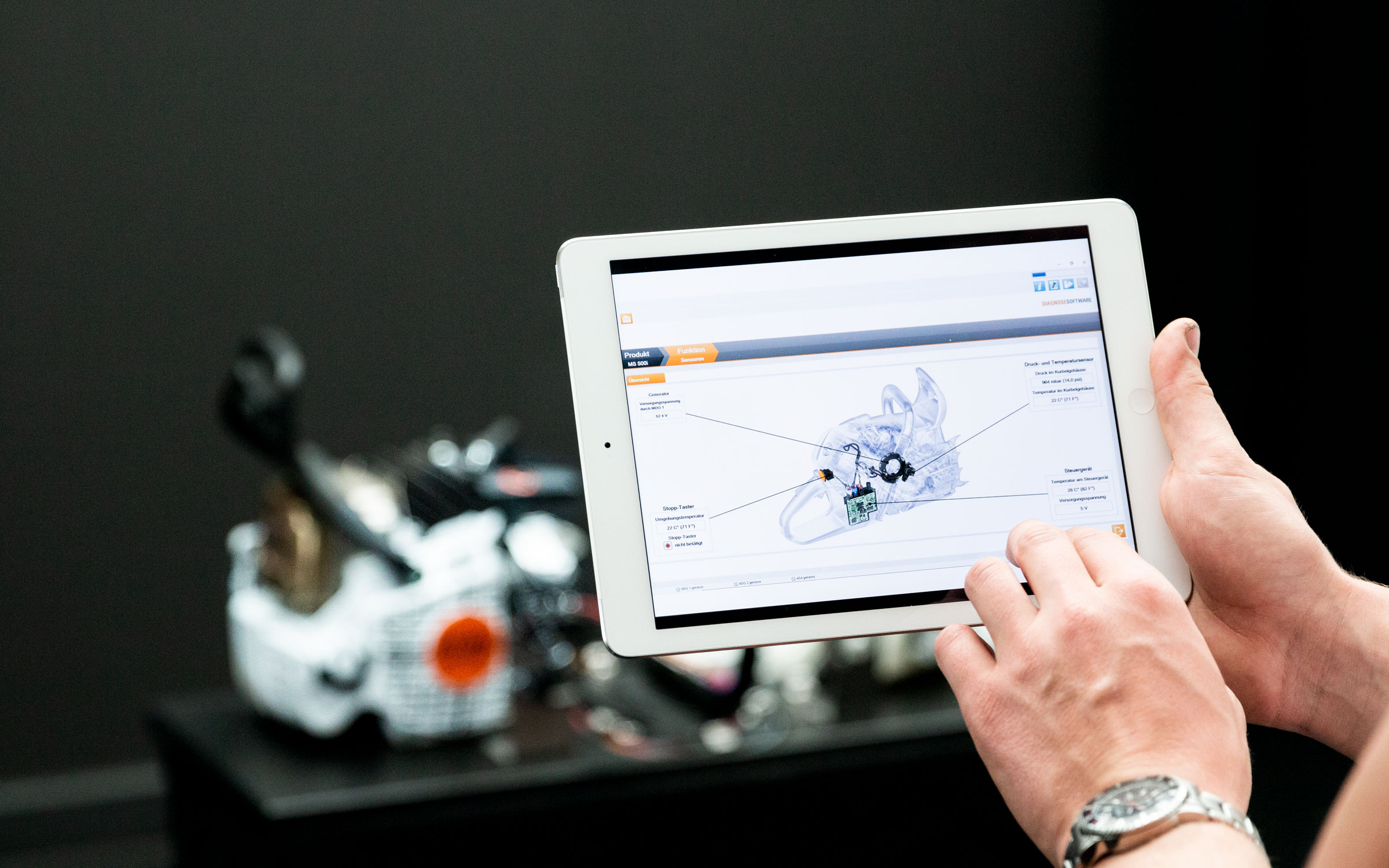 Bereits seit 2017 verfolgt die RWU ein fächerübergreifendes und vernetzendes Lehrkonzept, bei welchem eine Motorsäge als sogenanntes Produktleitbeispiel zum Einsatz kommt. Als Weiterentwicklung wurde im Rahmen studentischer Projektarbeiten eine akkubetriebene Motorsäge der Firma STIHL mit verschiedenen Sensoren und einem Einplatinencomputer ausgestattet. Dank des Umbaus können nun in der Lehrveranstaltung Messwerte wie Stromstärke, Spannung oder Motordrehzahl während des Betriebs erfasst und den Studierenden auf ihrem digitalen Endgerät zugänglich gemacht werden.