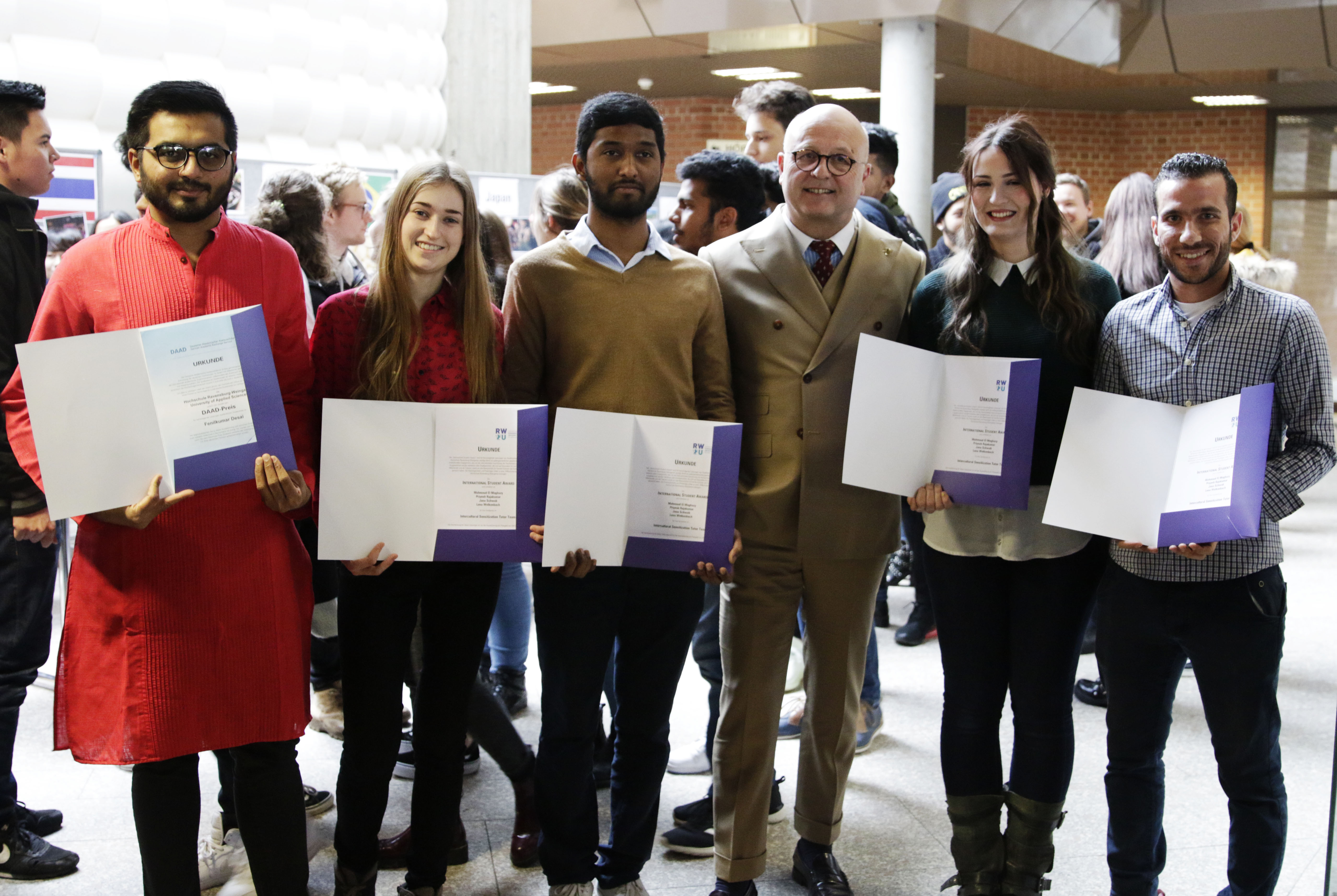Sie integrieren sich problemlos in eine für sie zunächst fremde Kultur, bemühen sich um Toleranz und das Bewusstsein fremder Traditionen. Deshalb wurden fünf Studierende der Hochschule Ravensburg-Weingarten (RWU) nun im Rahmen des „International Day“ mit dem DAAD-Preis sowie dem International Student Award der Hochschule ausgezeichnet. Verliehen wurden die Urkunden von Professor Dr. Michael Pfeffer, Prorektor für Forschung, Internationales und Transfer.