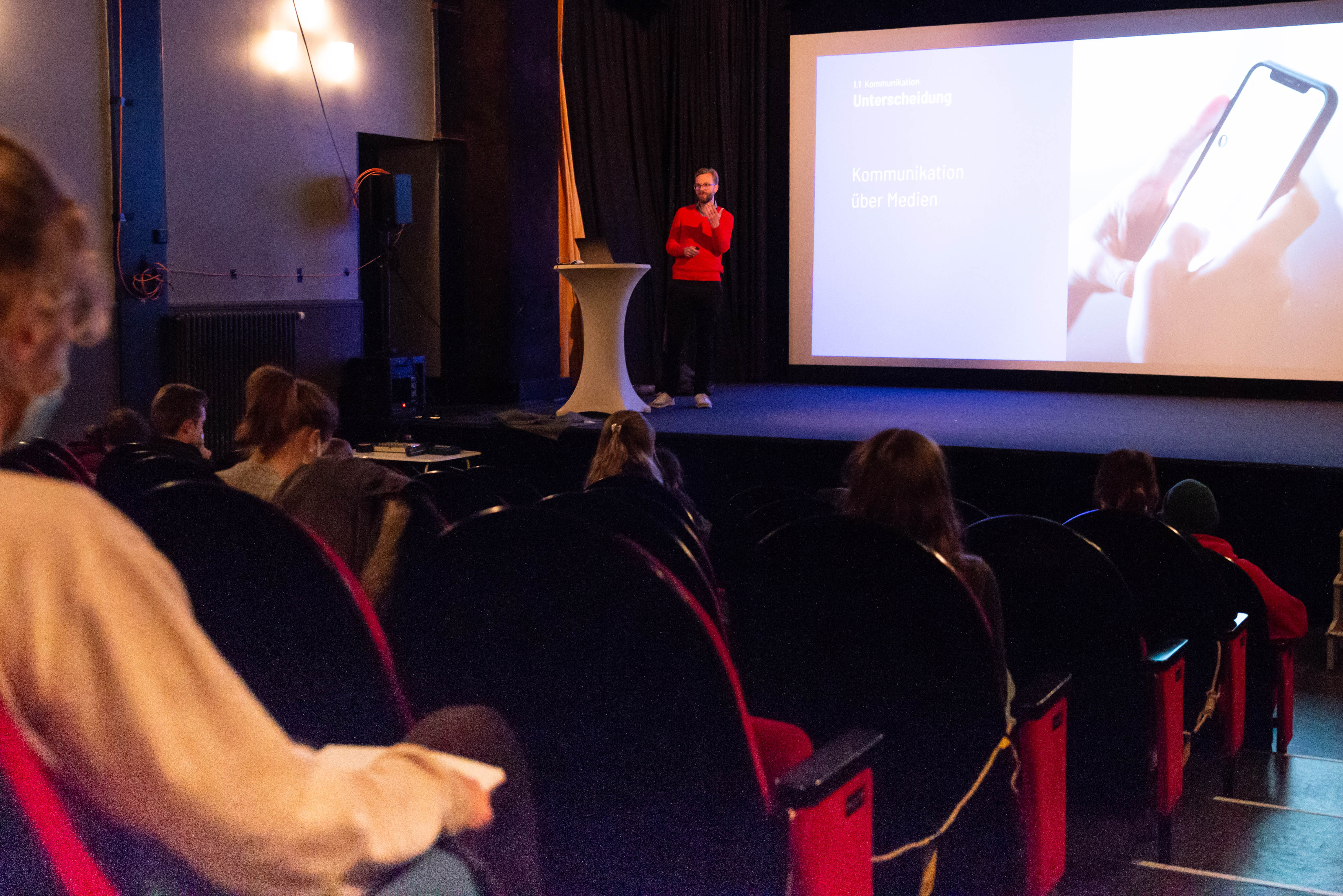 „Die Atmosphäre in der Linse ist schön“, sagt Lukas Sliazas, Mediendesign-Student im ersten Semester. Besonders die Präsentation auf der großen Kinoleinwand und die bequemeren Sitze sieht er als Gewinn. Die Kinostimmung, traditionell von gemütlichen Lichtverhältnissen geprägt, hat aber auch Nachteile: „Das Mitschreiben ist im Saal ein wenig schwierig“, sagt der Erstsemester.