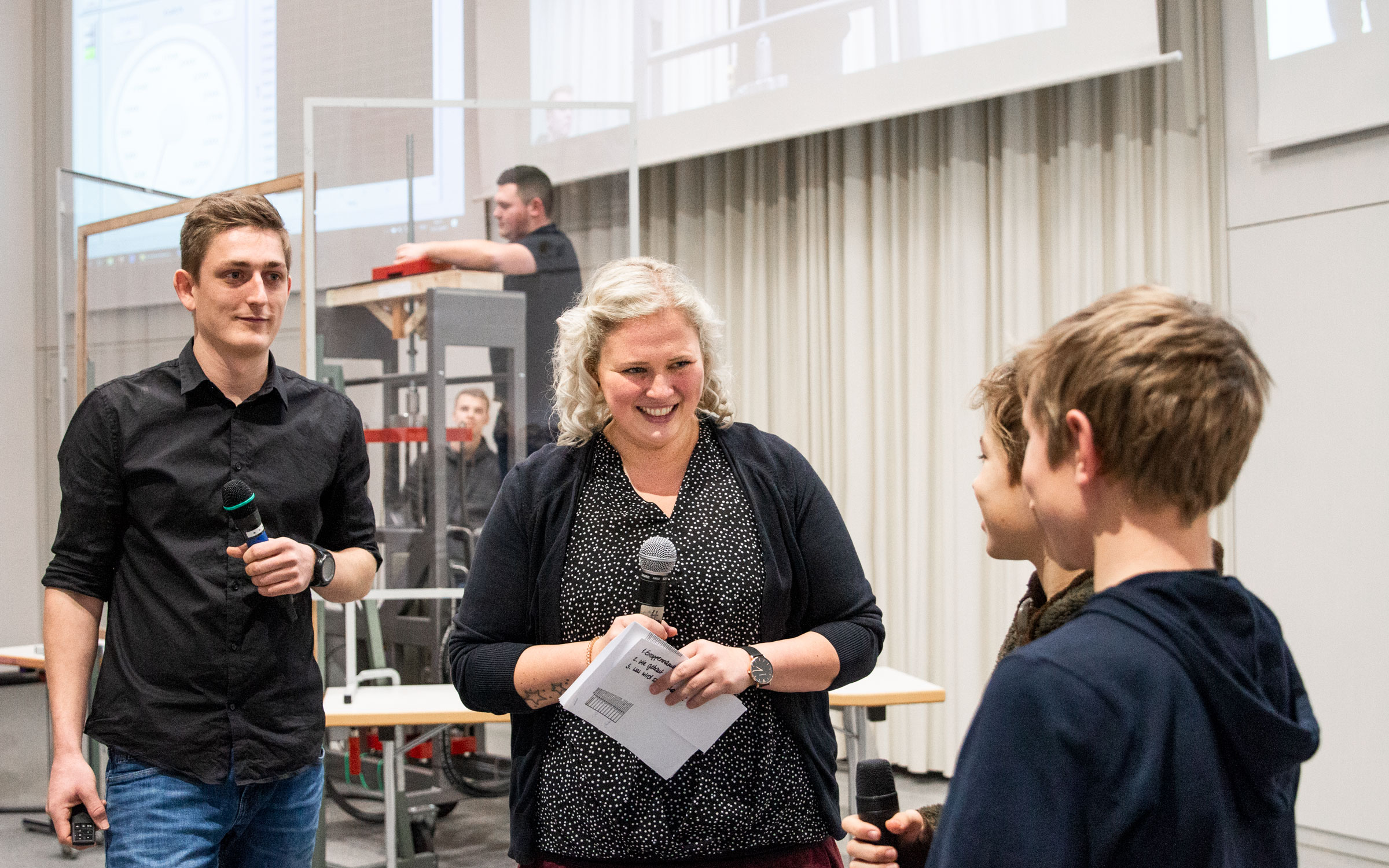 Unter den Gästen waren nicht nur die stolzen Eltern und Großeltern der jungen Teilnehmerinnen und Teilnehmer, sondern auch Lehrer, Freunde und interessierte Gäste. Gespannt verfolgten sie, wie die Brücken eingespannt wurden, sich langsam bogen, wie die Belastungsanzeige immer weiter nach oben wanderte bis es knackte und die Brücke brach.