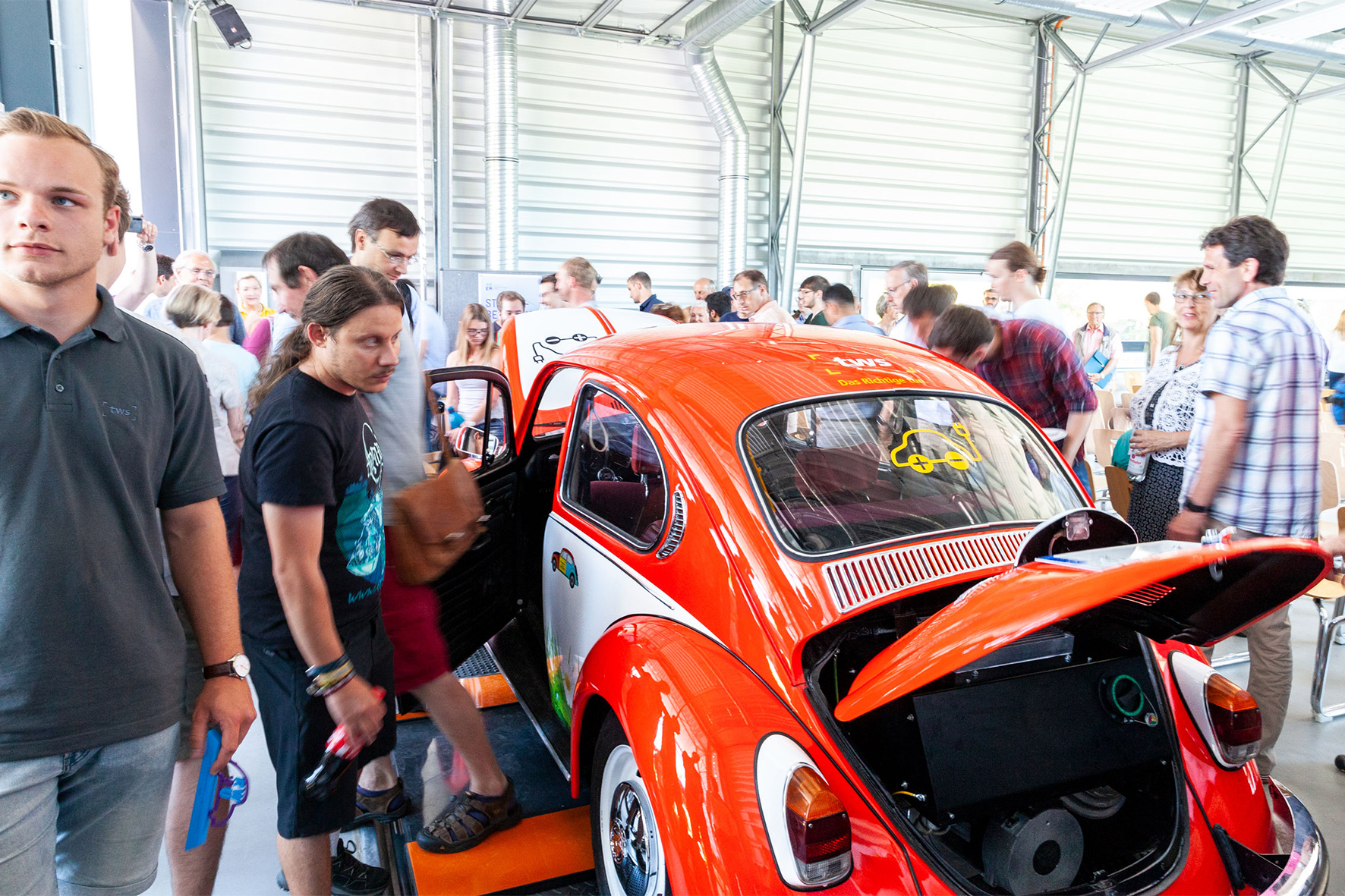 Im und vor dem Gebäude präsentierten sich studentische Initiativen, die im weiteren Sinne an Themen der Mobilität arbeiten. Eines dieser Projekte hatte am Tag der Elektromobilität noch seinen großen Auftritt: Die beiden RWU-Studenten Patrick Hantsche und Jacob Schicketanz enthüllten zusammen mit Elias Glatzel, Auszubildender bei den Technischen Werken Schussental, den VW Käfer, den sie in den zurückliegenden Monaten zum Elektroauto umgerüstet hatten. Unterstützt von den tws, der Autolackiererei Yardimci und Martin Irmler vom gleichnamigen Ingenieurbüro in Weingarten, haben die drei eine „Ikone des deutschen Maschinebaus flott gemacht für das 21. Jahrhundert“, so Professor Dr. Robert Bjekovic. Der rot-weiße Käfer wird zukünftig als Bestandteil der tws-Flotte auf den Straßen der Region zu sehen sein.